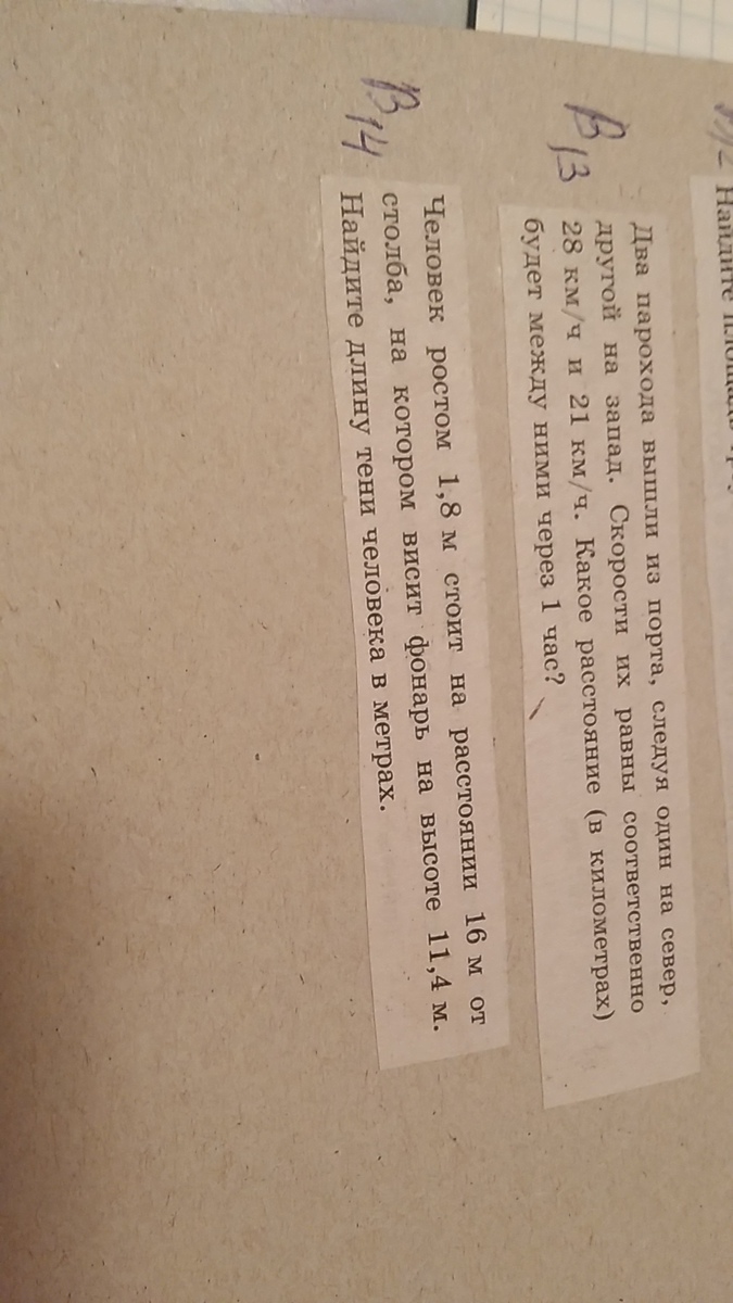 В13. их траектории образуют прямоугольный треугольник с катетами 21 и 28. соответственно через один час расстояние между ними будет равно гипотенузе треугольника S^2=21^2+28^2=1225, значит S=35 км.