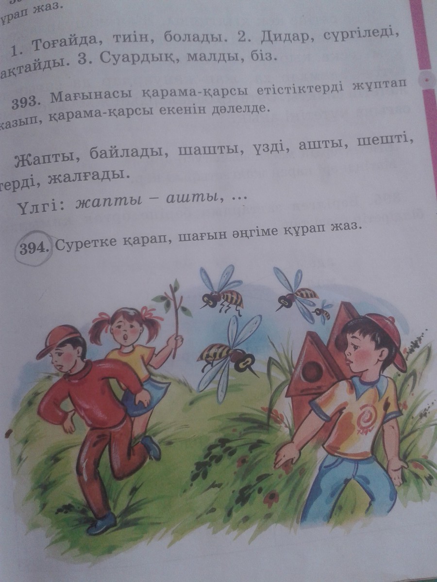 Марат,Сандугаш жане Жолман бирге омартага барады. Олар аралардын уйшигин шыбыгымен тарсылдатады.Буган ашуламган аралар оларды топ болып куады. Кашып куты алмаган ушеуин шагып тастайды