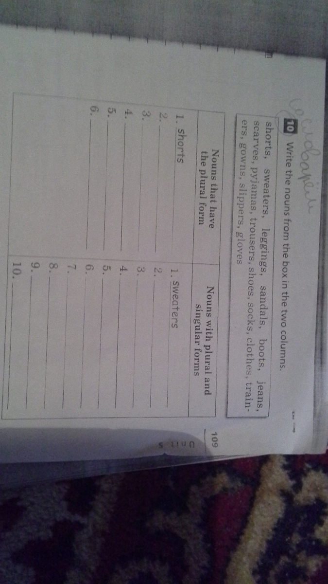 1.свитеры 2.сандали 3.ботинки 4.шарфы 5.кроссовки 6.туфли 7.носки 8.халаты 9.тапочки 10.перчатки