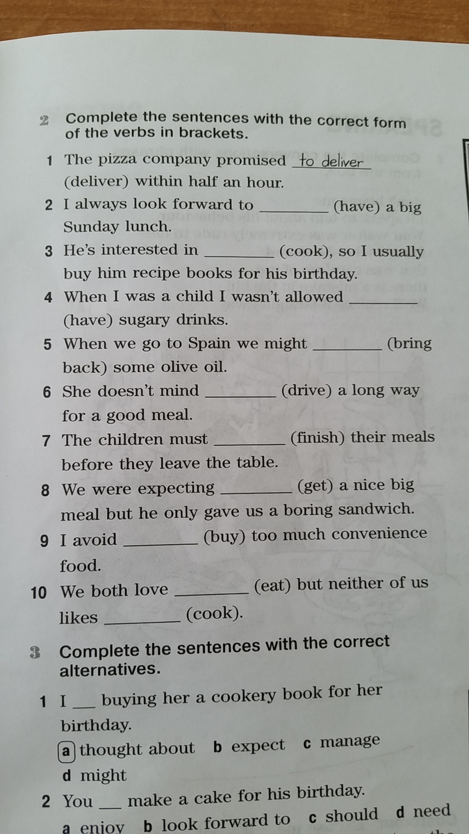 have, cooking, to have, bring back, driving, finish, getting, buying, eating, cooking