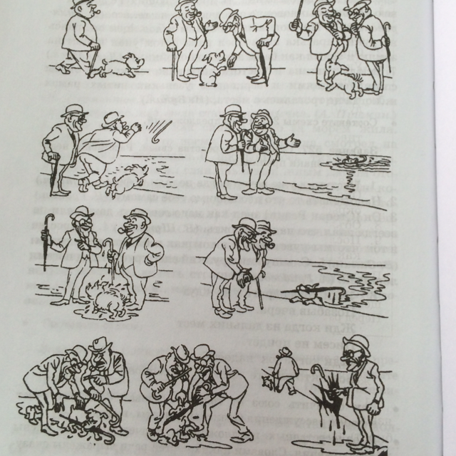 - Она у меня обречена , смотри как может!Он бросил в воду трость . Жучка сразу поплыла за ней . Когда она принесла трость хозяину Ивану Ивановичу стало интересно и он тоже бросил трость в воду .Жучка быстро поплыла за ней . Когда она приплыла она не захотела отдовать трость и сломала её . Иван Иванович разозлился на друга ,а Сергей Владимирович ушёл