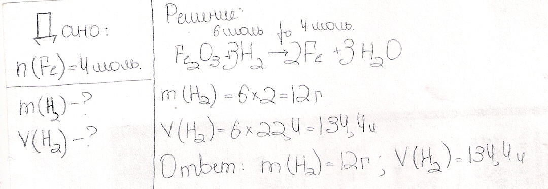 Вычислите массу и объём водорода (н.у), который вступит в реакцию с оксидом железа 3, если после реакции образуется 4 моль железа.