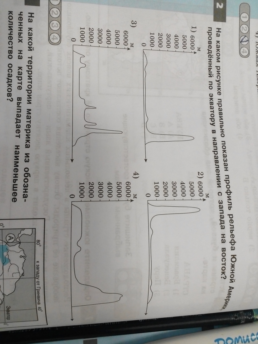 На каком рисунке правильно показан профиль рельефа Южной Америки, проведенный по экватору в направлении с запада на восток?