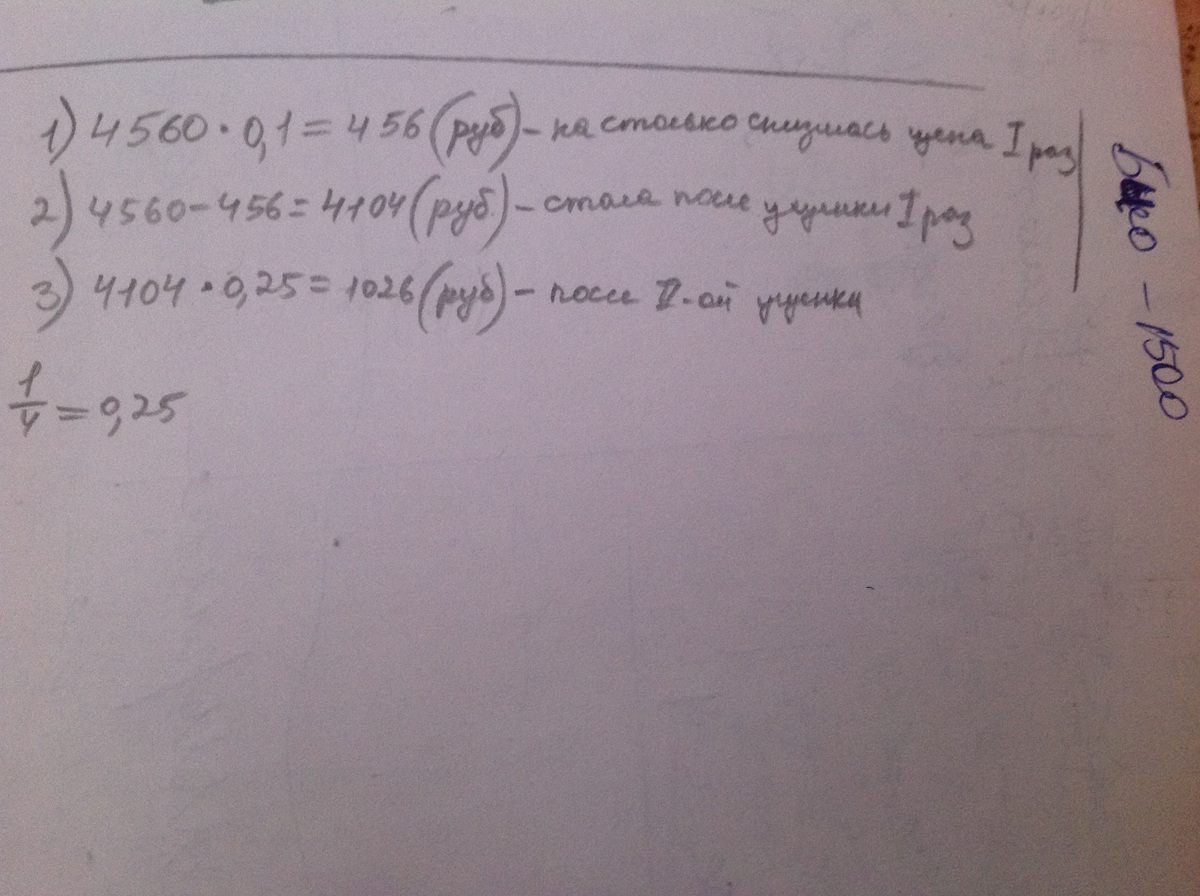 цену на снижали два раза.сначала на одну десятую часть за счёт экономии ткани а затем ещё на четверть от новой цены за счёт замены дорогостоящей ткани более дешёвой.какой стала новая цена на если его первоначальная цена была 4560 рублей.