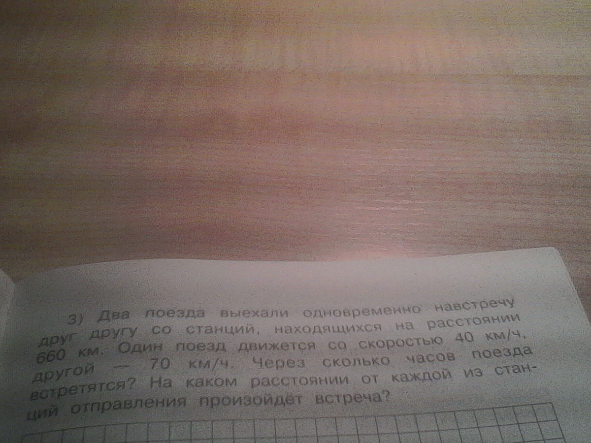 Два поезда выехали одновременно навстречу друг другу со станций, находящихся на расстоянии 660км.Один поезд движется со скоростью 40км/ ч, другой 70км/ ч. Через сколько часов поезда встретятся? На каком расстоянии от каждой из станций отправления произойдёт встреча