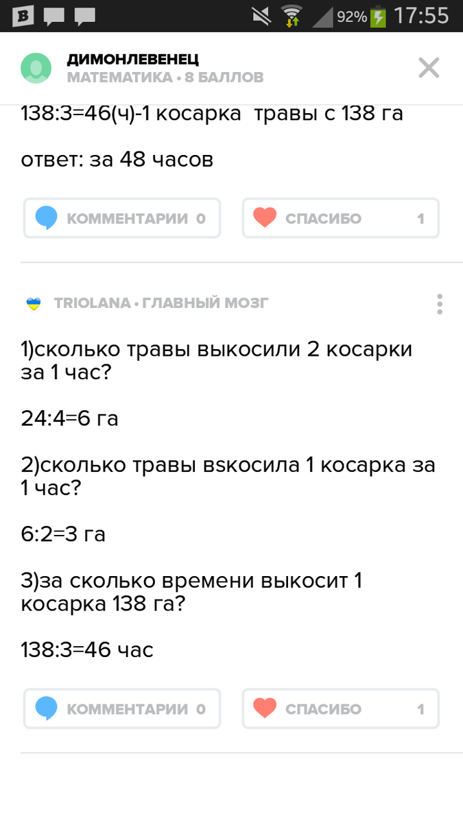 3)138:3=48(ч)-будет косить одна косарка 138гектаров травы