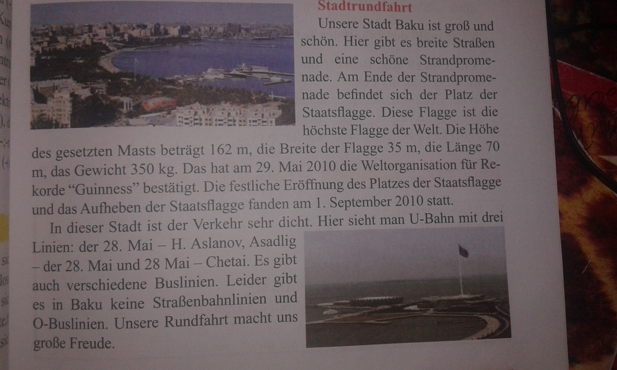 Наш город Баку - большой и красивый.Здесь есть широкие улицы и прекрасная набережная . В конце набережной находится площадь с национальным флагом. Этот флаг - самый высокий флаг мира. Высота установленного столба составляет 162 м , ширина флага-32 м, длина-70 метров, вес-350 кг. 29 мая 2010 г всемирная организация установила рекорд Гиннеса . Праздничное открытие площади государственного флага и отмена гос. флага 1 сентября 2010г