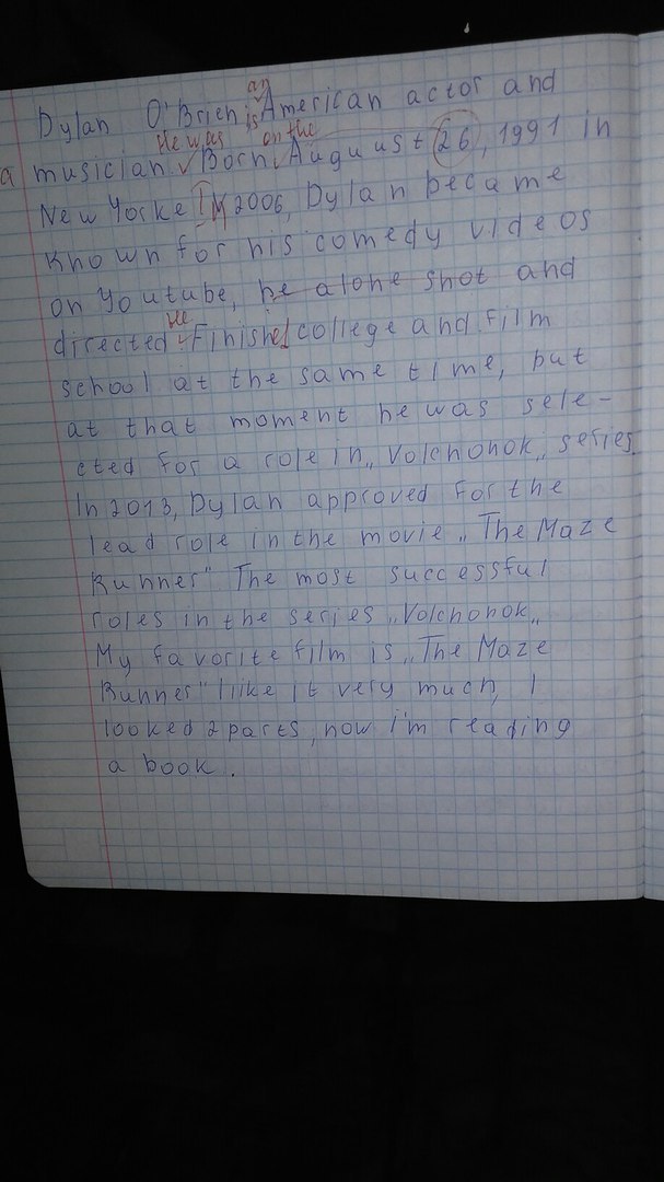Дилан О'брайен из эн америкэн эктэ энд э мьюзишн. Хи вос бон он зе твенти сикс оф огуст найнтин найти уан ин Нью Йорк. Ин твенти оу сикс Дилан бэкейм ноун фо хис камеди видеос он ютьюб директед. Хи финишт колледж энд филм скул эт зе сэйм тайм бат эт зэт моумент хи вос селектед фо а рол ин "тин вульф" сериэс. Ин твенти сётин Дилан аппрувт фо зе лид рол ин зе муви "зе мэйз раннер". Зе мост саксессфул ролс ин зе "тин вульф" сериэс. Май фэйврит филм ис "Зе мэйз раннер". Ай лайк ит вери мач, ай лукт ту патс нау айм ридин а бук