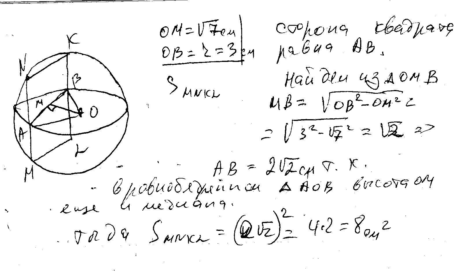вершины квадрата лежат на поверхности шара радиуса 3 см. Расстояние от центра шара до плоскости квадрата корень из 7. найдите площадь квадрата. если можно с рисунком, спасибо)