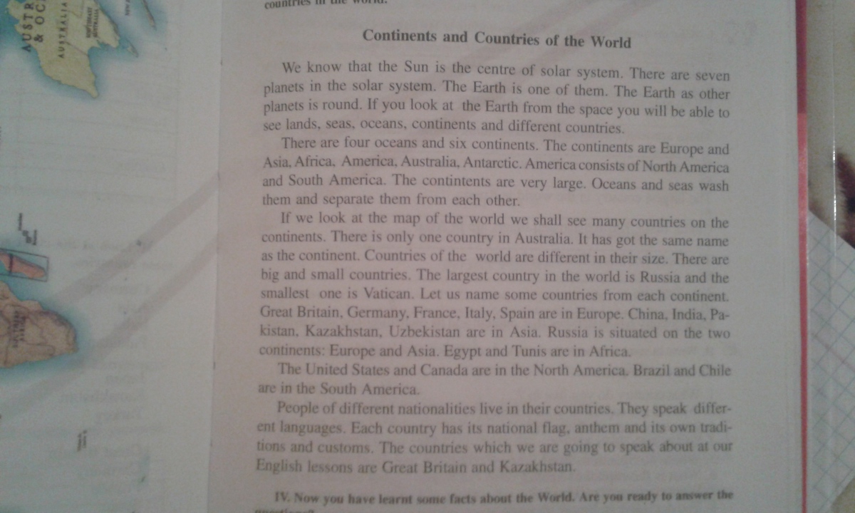 Есть четыре океанов и шесть континентов на Земле. Континенты являются: Евразия, Африка, Австралия, антарктический, Северной и Южной Америке. Континенты очень велики. Океаны и моря мыть их и отделить их друг от друга. Есть много стран, как правило, на каждом континенте. Есть более 40 стран в Африке, но есть только одна большая страна в Австралии. Исландия является очень маленькая страна. Он расположен на острове на севере Европы. Соединенное Королевство, Франция, Германия, Испания, Италия в Европе в то время как Китай, Индия, Вьетнам находятся в Азии. Канада и Соединенные Штаты находятся в Америке. Египет является одной из африканских стран.