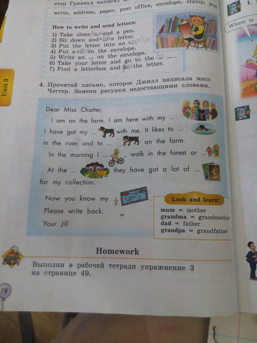 прочитай письмо, которое Джилл написал мисс Четтер. Замени рисунки недостающими словами. Прошу сроч