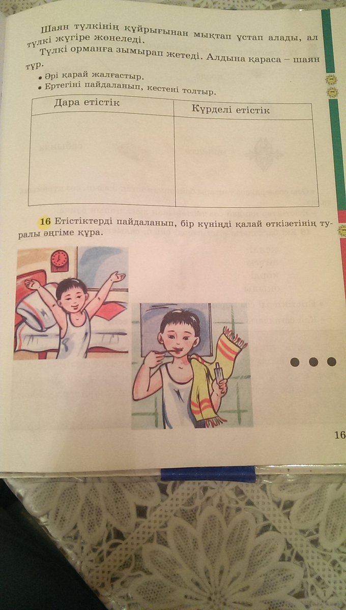 Мен сағат 6:30 да тұрамын. Тосегимди жинастырып, бети колымды жуып, таңғы асымды ишип аламын. Сағат 7:00 де Мектеп киимимди киип , мектепке шығамын. Мектеп сағат 8;00 де битеди,сагат 13:15 те сабак аяқталады. сағат 14:00 де үйде боламын. Киимимди илгишке илип, жинастырып, туски асымды ишемин. Содан кейін сабактарымды окимын. Сағат 20:15 те теледидар коремин. Сагат 21;30 да жуынып, төсек салып, сағат 22;00 де ұйқыға кетемин.