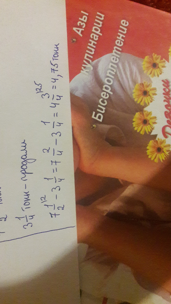 Из семь одна вторая тонн картофеля магазин продал три одна четвёртая Сколько тонн картофеля осталось?