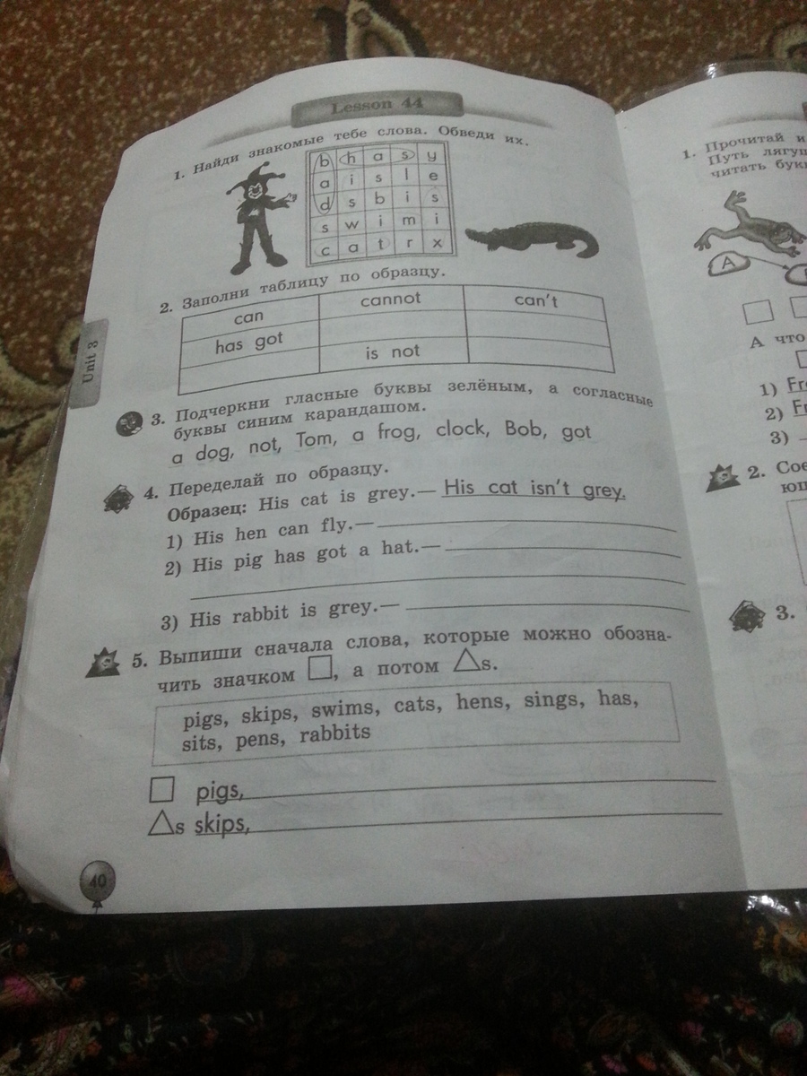 слова под значком белого треугольника с s (глаголы 3 лица, ед.ч.) - skips, swims, sings, has, sits