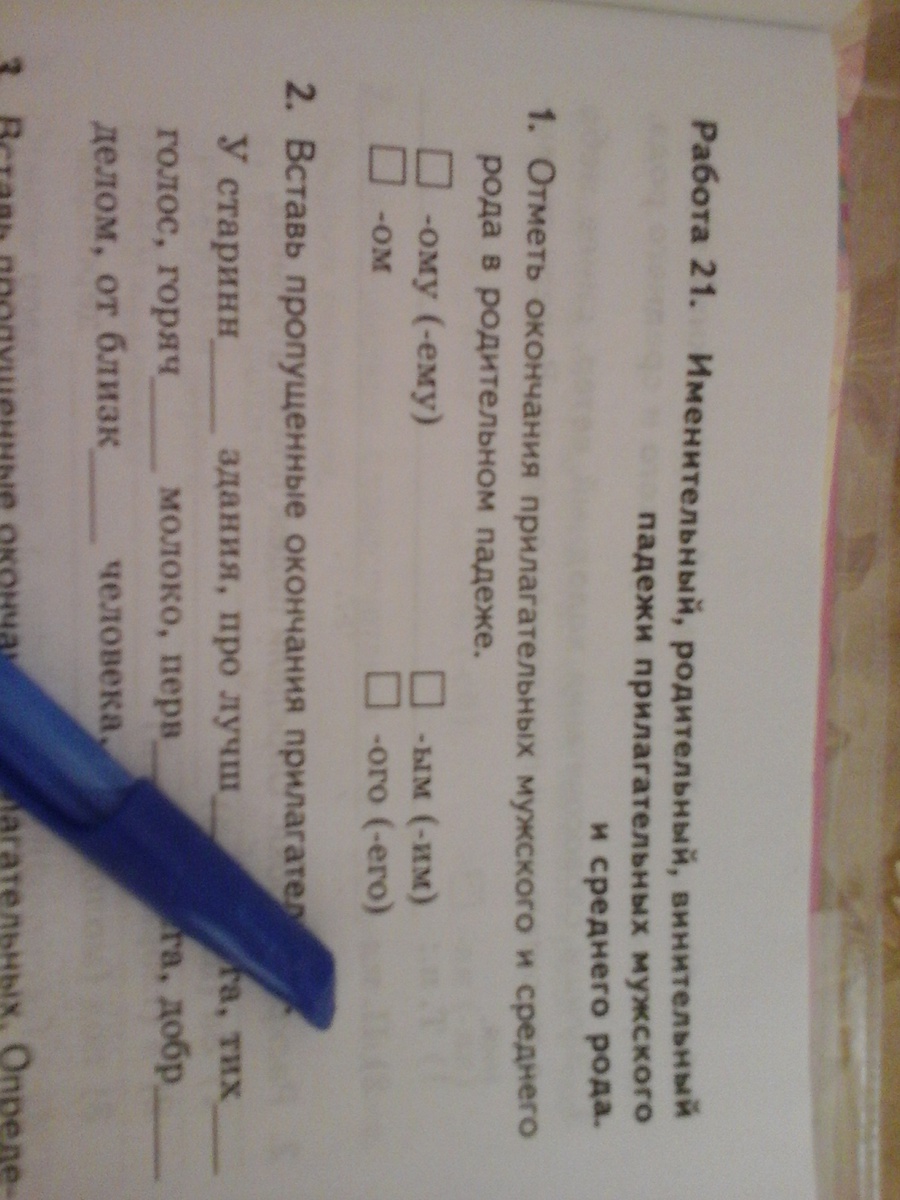 Отметь окончания прилагательных мужского и среднего рода в родительном падеже 1) ому ( ему ) 2) ом 3 ) ым ( им ) 4 ) ого ( его )