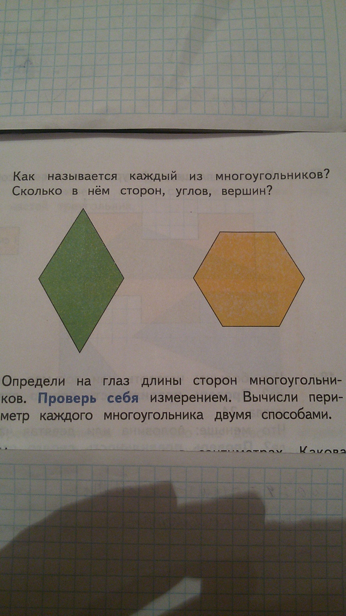 1) четырехугольник, 4 угла, 4 вершины, 4 стороны, 2) шестиугольник, 6 углов, 6 вершин, 6 сторон