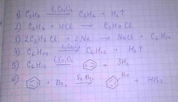 С3H8---->C3H6----->C3H7Cl---->C6H14--->C6H12---->C6H6--->C6H5Br