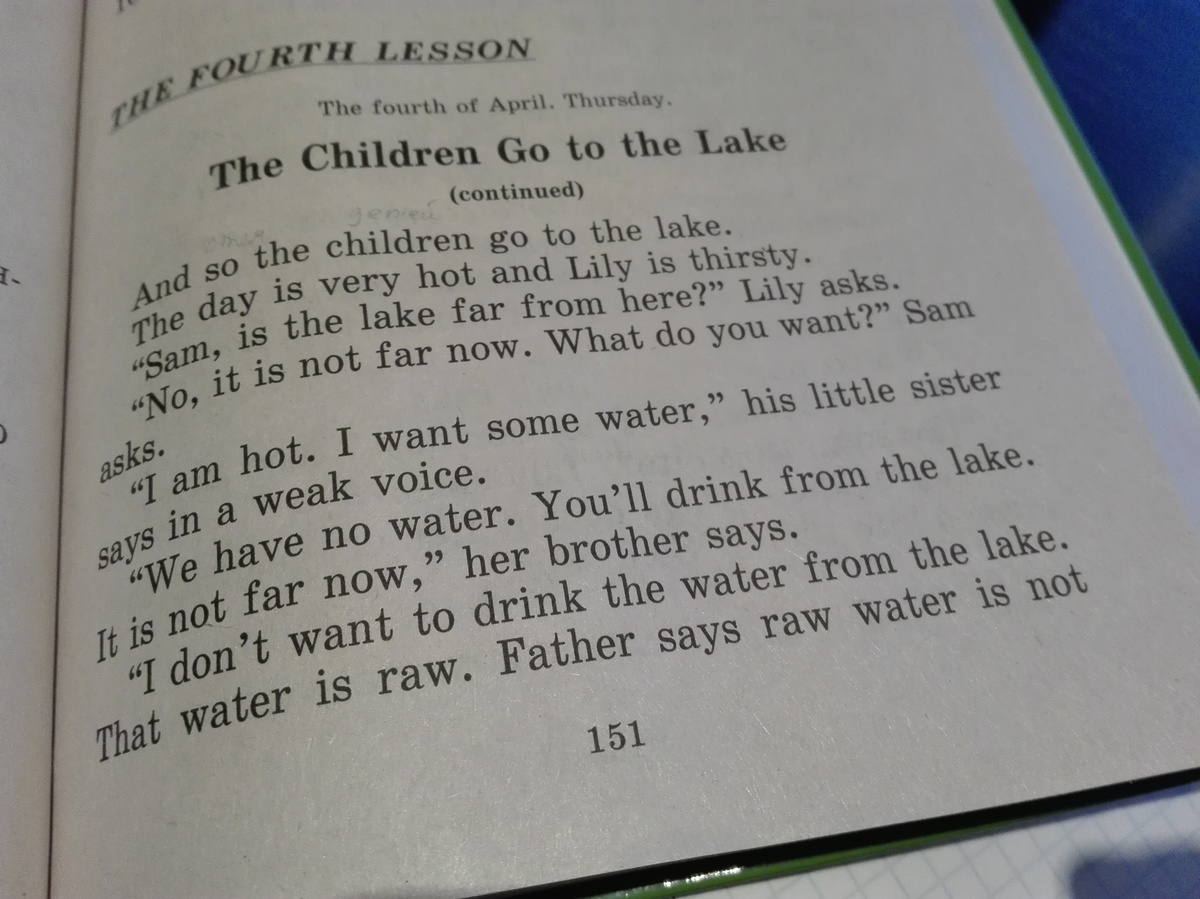 Дети ходят к озеру.И так дети ходят к озеру. День очень жаркий и Лили испытывала жажду. Сэм озеро далеко от сюда? Лили спросила. Нет уже не так далеко.Чего ты хочешь? Сэм спросил.Мне жарко.Я хочу немного воды, его сестра сказала слабым голосом.У нас нет воды. Ты попьешь из озера. Оно уже не так далеко. ее брат сказал. Я не хочу пить воду из озера.Эта вода сырая.Отец сказал сырую воду не.....