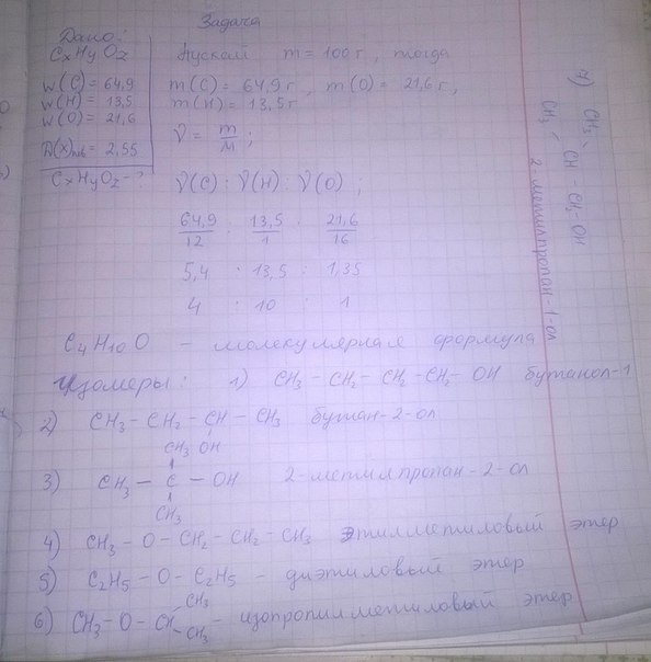 органическое вещество, в котором массовая доля углеводорода равна 64,9 %, кислорода 21,6%, водорода 13,5%, имеет относительную плотность паров по воздуху 2,55%. Определите молекулярную формулу вещества, составьте формулу взаимных изомеров и назовите их. По возможности, фотографией.