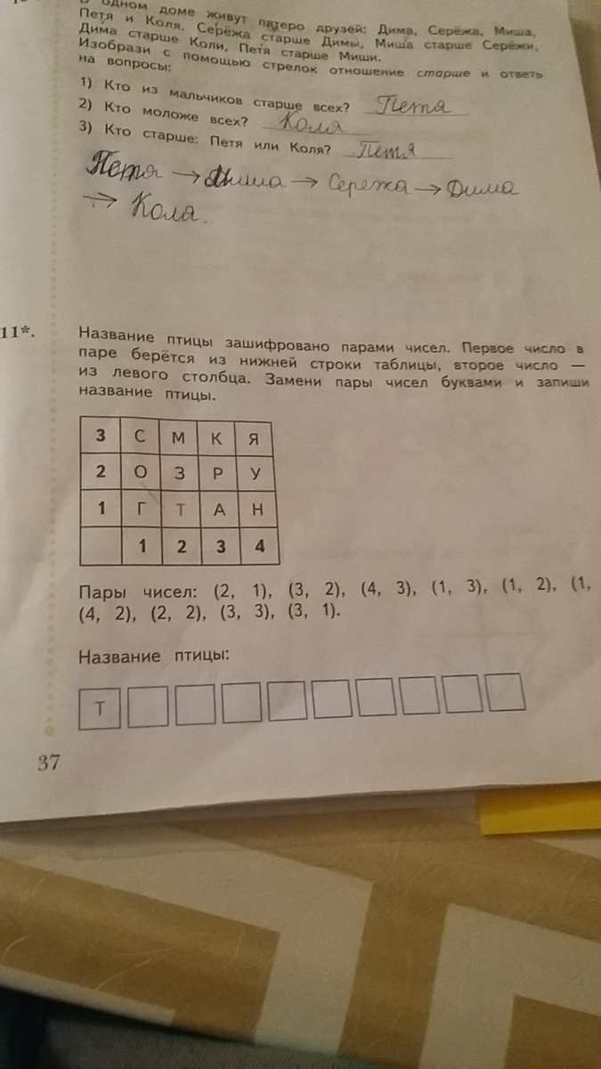 название птицы зашифровано парами чисел. Первое число в паре берется из нижней строки таблицы, второе число -из левого столбца. Замени пары чисел буквами и запиши название птицы.