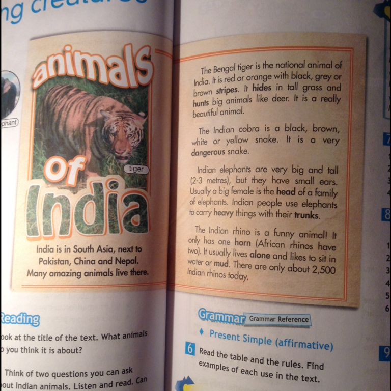 Бенгальский тигр - национальное животное Индии. Он красный (рыжий) или оранжевый с черными, серыми или коричневыми полосами. Он прячется в высоко траве и охотится на больших животных, например, оленя. Это очень красивое животное.
