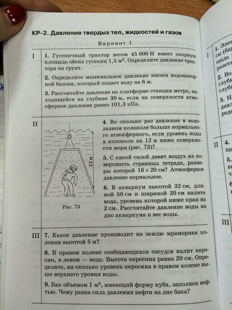 7.p=F/S, где F-сила давления в нашем случае, это mg, S - площадь. m=V*po (po-плотность мрамора) V=S*h, следовательно, p=mg/S=V*po*g/S=S*h*g*po/S=h*po*g= 5*9.8*2700=132.3 (кПа)
