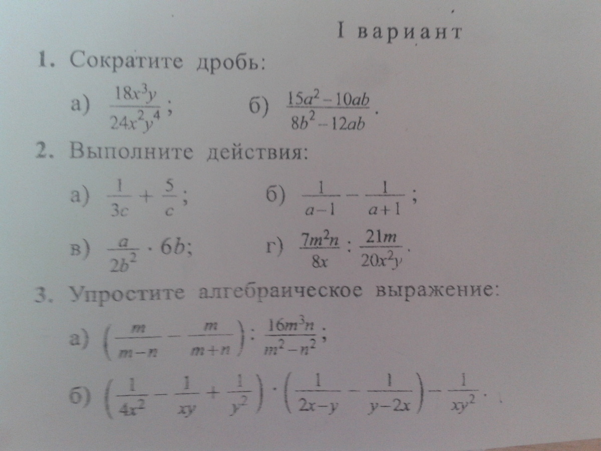 помогите решить пожалуйста мне очень нужно.Задания во влажениях у меня.Это дроби ну вы когда будите решать вот этой палочкой / обозначайте дробь. Вот так например 18x в кубе y / 24x в квадрате y.