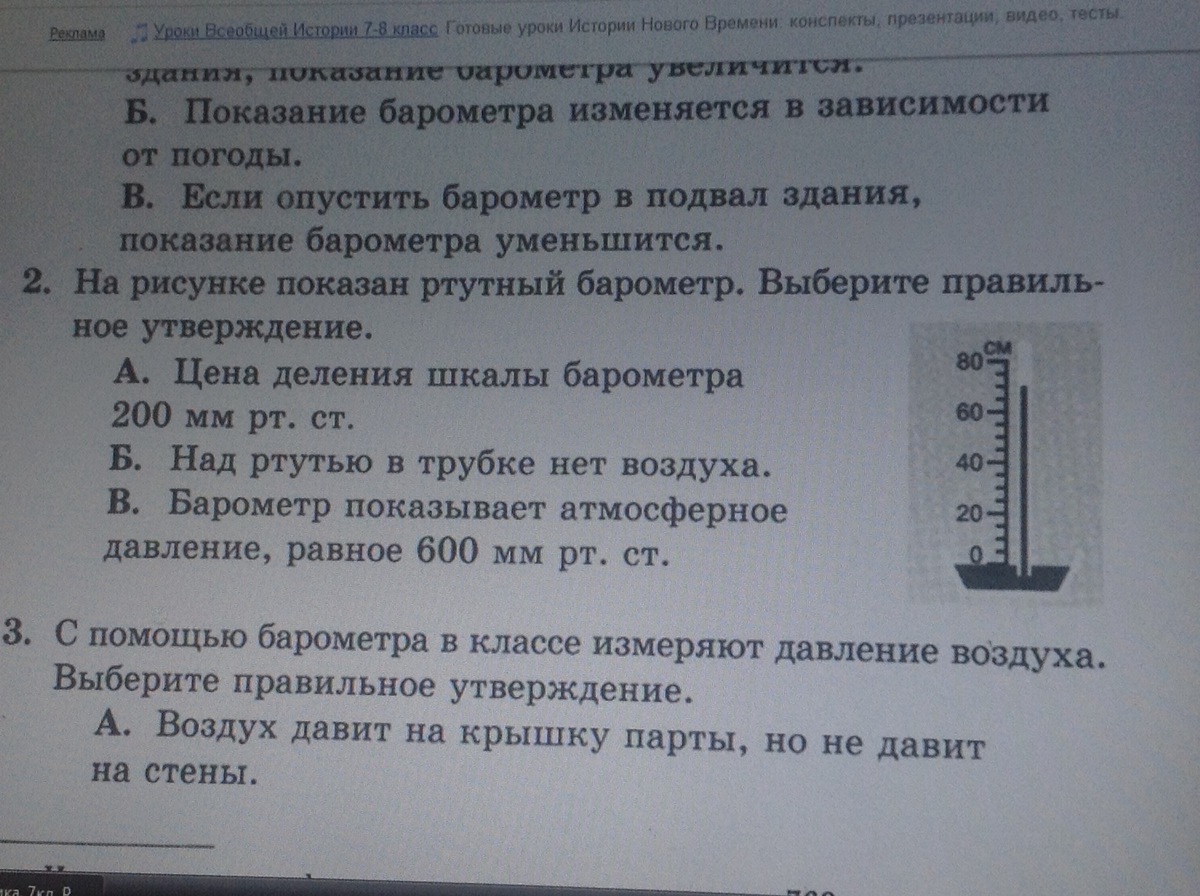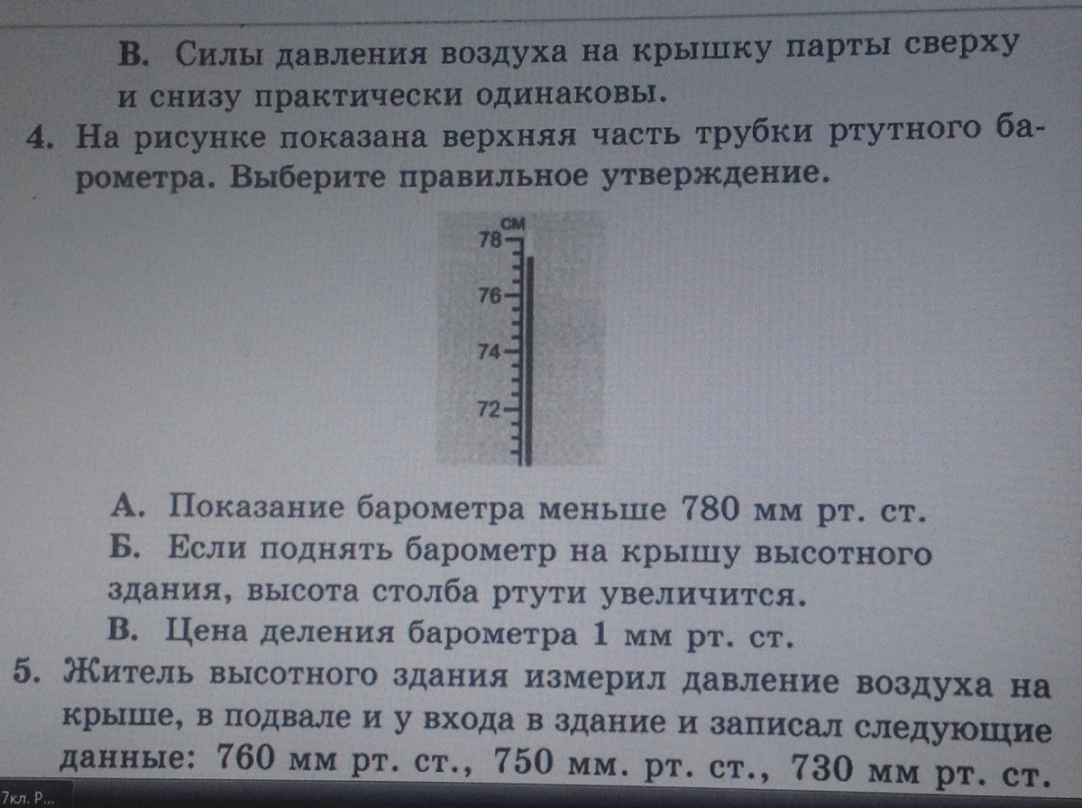 1. С помощью барометра в классе измеряют давление воздуха. Выберите правильное утверждение: