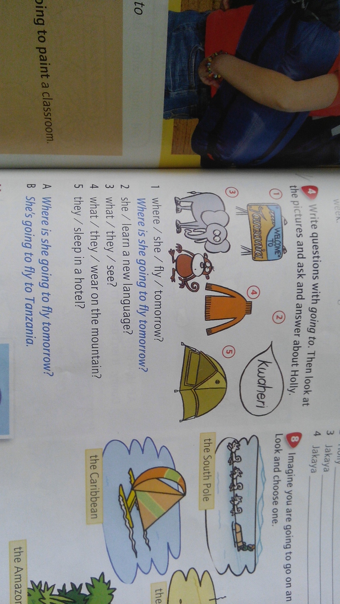 2. is she going to learn new language? (не знаю, что такое kwaheri)) но ответ будет начинаться так: she is going to learn language. 3.what are they going to see? they going to see an elephant with monkey. 4.what are they going to wear on the mountain? they are going to wear sweater. 5. where are they going to sleep in a hotel? they are going to sleep in the tent