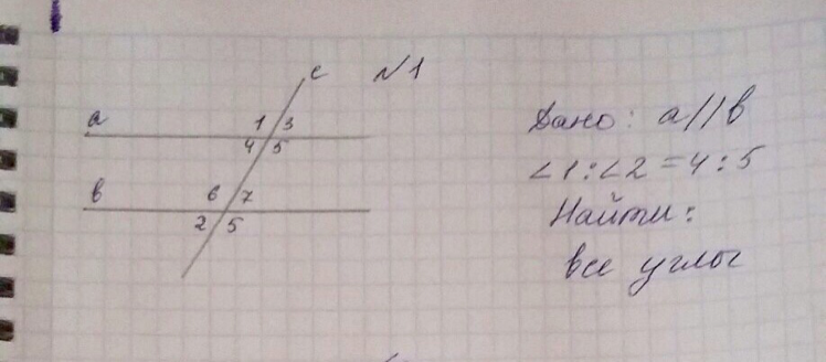 сумма углов 1 и 2 равна 180°. ∠1 составляет 4 части, а ∠ 2 - пять частей, всего 9 частей.