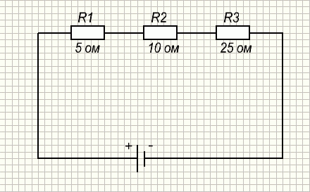 Т.к. резисторы соединены последовательно, то общее сопротивление будет сумма напряжений на резисторах т.е. 5+10+25 = 40 Ом.