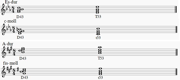 Тональности с тремя знаками - Es-dur-c-moll (3♭) и A-dur-fis-moll (3♯).