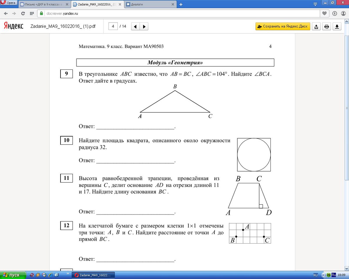9) ABC-основания равнобедренного треугольника равны тогда угол А и угол С равны как основания отсюда следует сто угол А=углу С=(180-104):2=38 угол А=38 и угол С=38