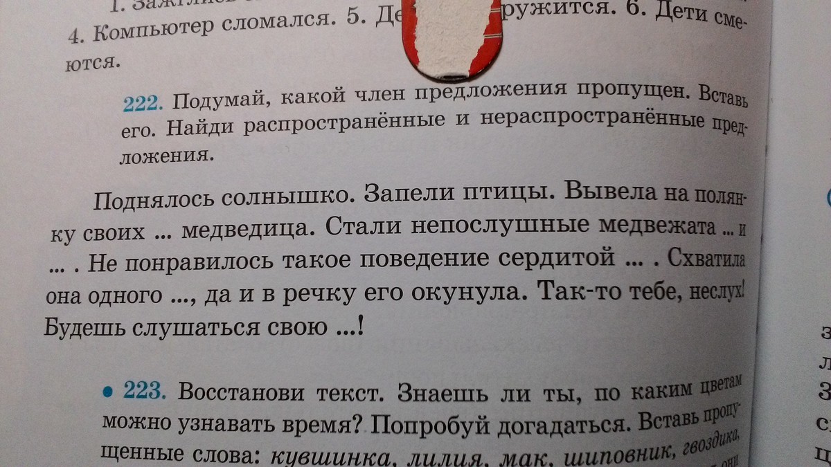 Поднялось солнышко.(распр) Запели птицы(распр). Вывела на полянку своих непослушных медвежат медведица(распр). Стали непослушные медвежата баловаться и играть(распр). Не понравилось такое поведение сердитой медведице.(распр) Схватила она(нераспр) одного неслуха, да и в речку окунула. Так-то тебе, неслух.(нераспр) Будешь слушаться свою мать!(нераспр)