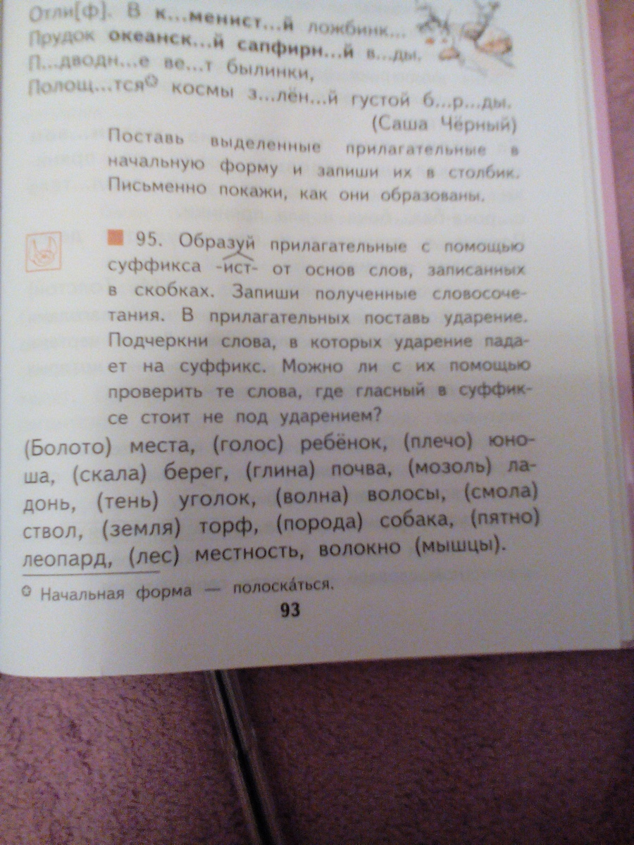 Болотистые места,голосистый ребёнок,плечистый юноша,скалистый берег,глинистая почва,мозолистая ладонь,тенистый уголок,волнистые волосы,смолистый ствол,землистый торф,породистая собака,пятнистый леопард,лесистая местность последнее не знаю сори