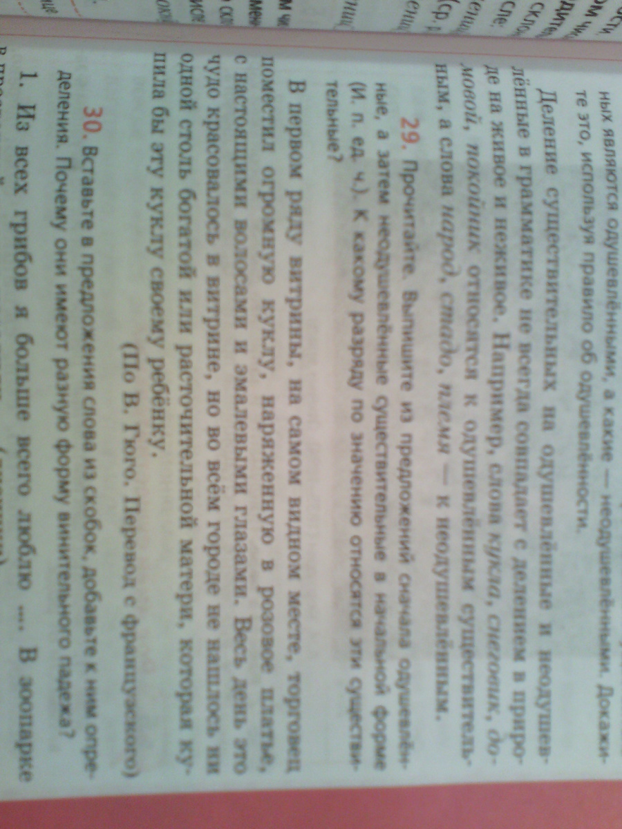 неодушевленные:ряд,витрина,место,кукла,платье,волос,глаз,день,чудо,город