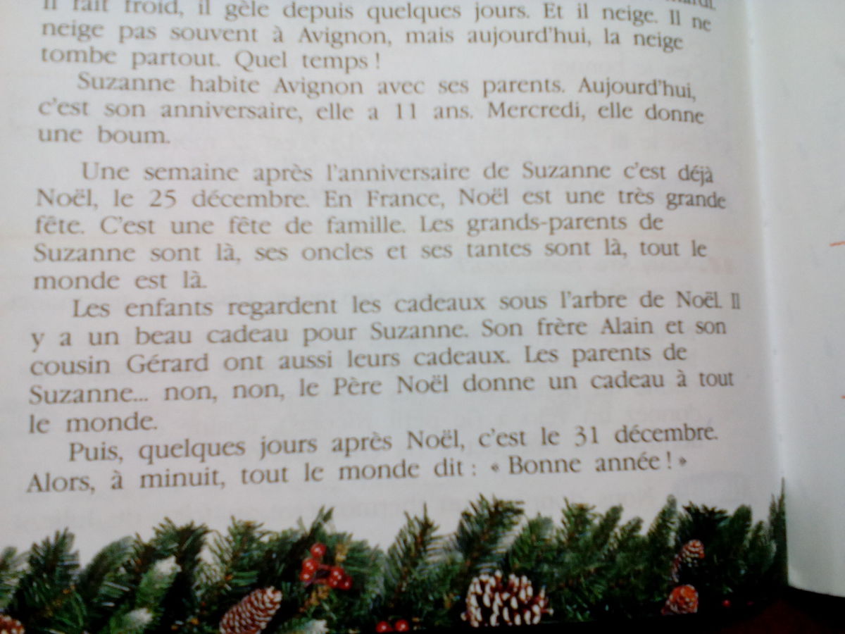 Сюзанна живет в Авиньоне со своими родителями. Сегодня у нее день рождения, она составляет 11 лет. Среда она закатить вечеринку. Через неделю после рождения Сюзанны уже Рождество, 25 декабря. Во Франции Рождество это очень большая вечеринка. Это семейный праздник. Сюзанн бабушки и дедушки, дяди и тетки, все. Дети наблюдают подарки Рождественская елка является прекрасным подарком для Сюзанны Alain Его брат и его двоюродный брат Жерар также имеют свои подарки Родители Сюзанны ... нет, нет, Санта-Клаус дает подарок каждому. Затем, через несколько дней после Рождества 31 декабря. Так полночь, все говорят, что Happy New Year