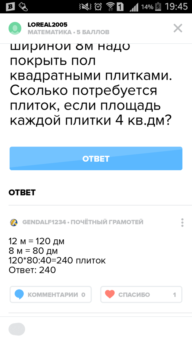 В зале длиной 12м и шириной 8м надо покрыть пол квадратными плитками. Сколько потребуется плиток, если площадь каждой плитки 4 кв.дм?