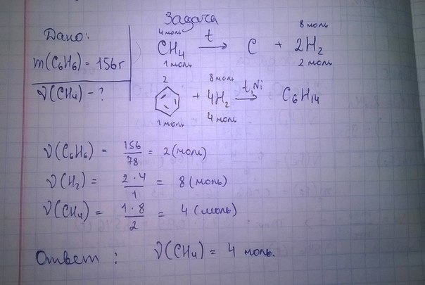 сколько молей метана нужно полностью разложить для того чтобы количество образованных водородом было достаточно для гидрогенизации 156 грамм бензола