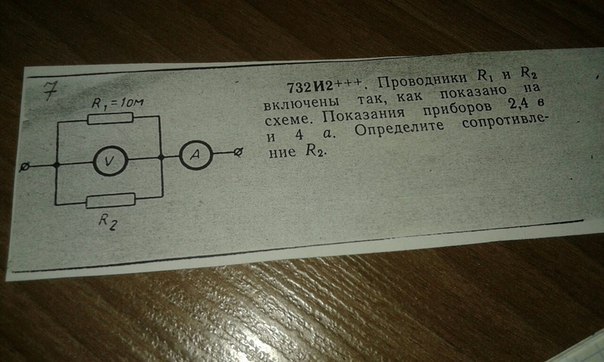 Проводники R1 и R2 включены так, как показано на схеме. Показания приборов 2,4в и 4а. Определите сопротивление R2