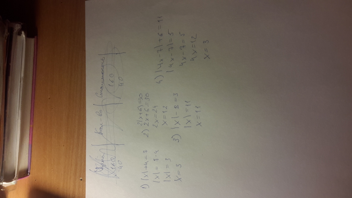 1) |x|+4=7 2) 2|x+6|=30 3) |x|-8=3 4) |4x-7|+6=11