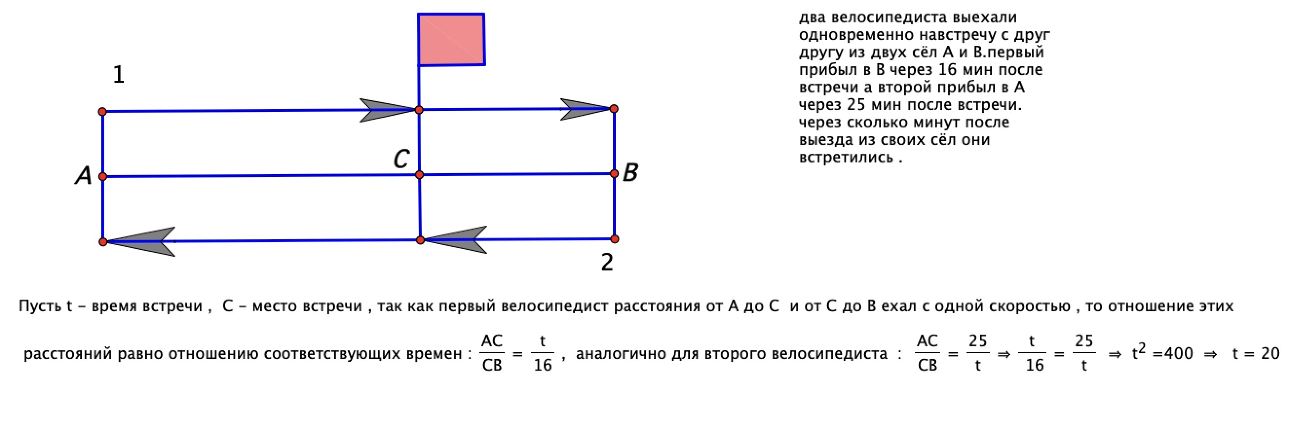 два велосипедиста выехали одновременно навстречу с друг другу из двух сёл A и B.первый прибыл в B через 16 мин после встречи а второй прибыл в A через 25 мин после встречи. через сколько минут после выезда из своих сёл они встретились .ПОМОГИТЕ СРОЧНО ПОЖАЛУЙСТА.