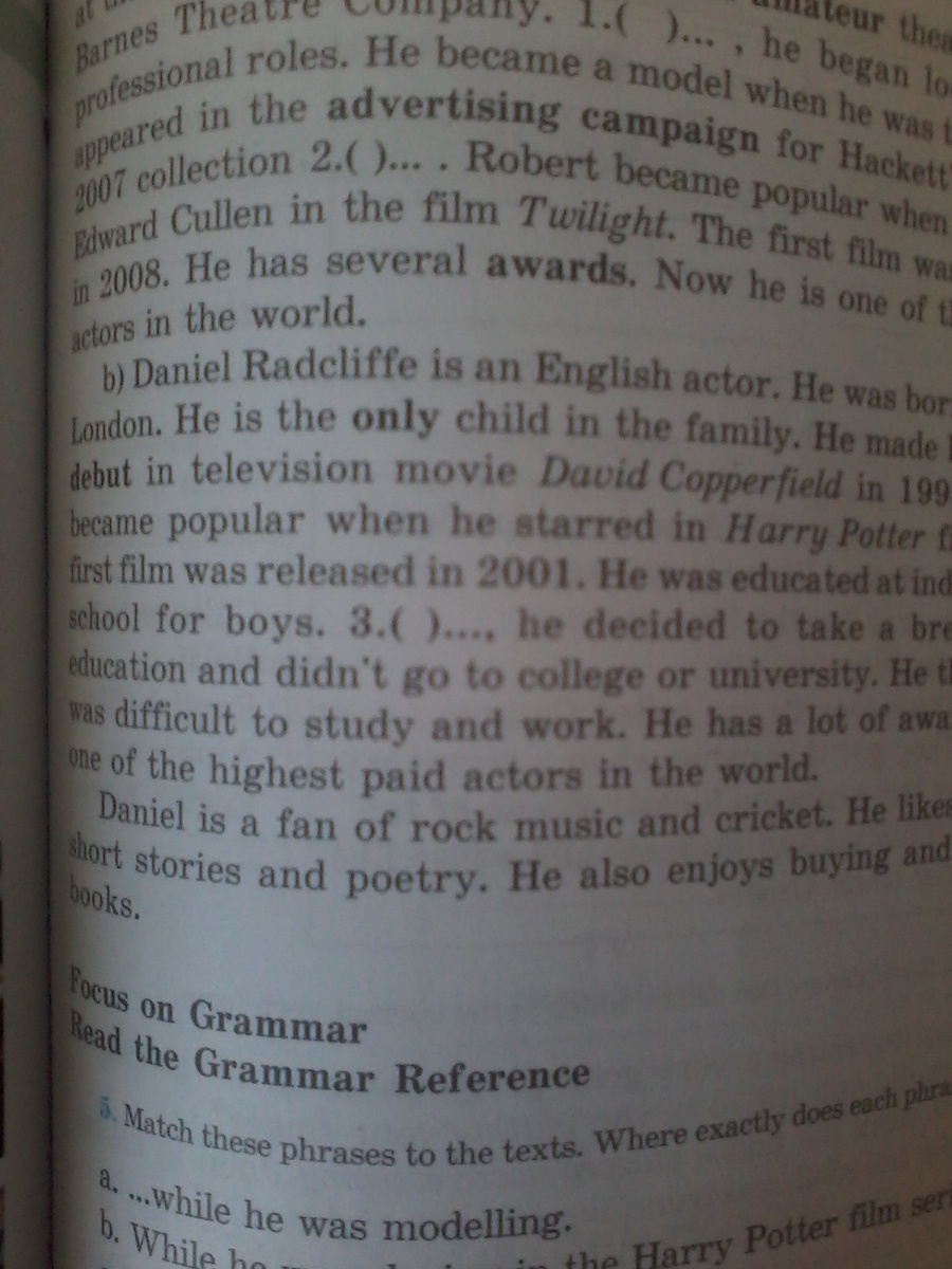 Дэниел Рэдклиф английский актер. Он родился в Лондоне.Он единственный ребенок в семье.Он делал его карьеру в фильме "Дэвид Куперфляйд" в 1999,до того как он стал популярен в фильме "Гарри Поттер".Первый фильм вышел в 2001 году. Он обучался в школе для мальчиков. 3. Он взял паузу в обучении и не пошел в колледж или университет. Ему было сложно учиться и работать.У него был длинный путь, до высшего актера в мире.
