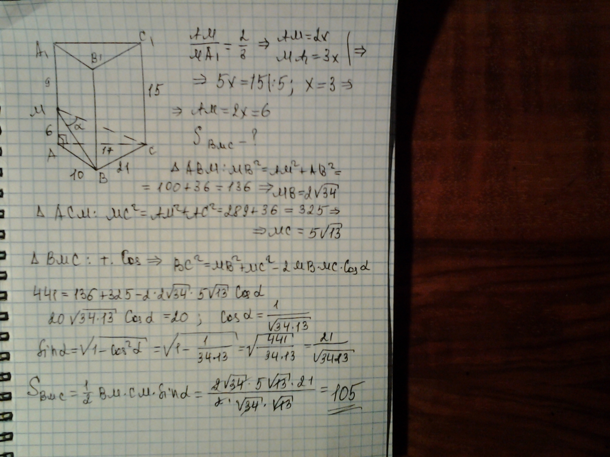 В осн. Прям. Призмы лежит треугольник ABC со сторонами ab=10,bc=21,ac=17. Боковое ребро aa1=15 точка m€aa1 и am:ma1=2:3. Найдите площадь сечения bmc .