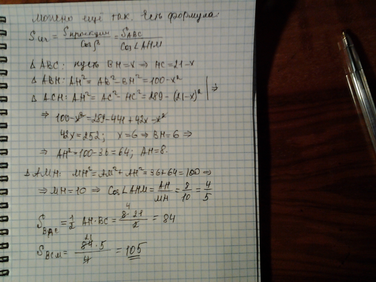 Применены: теорема Пифагора, теорема косинусов, формула площади треугольника через синус, формула площади сечения через площадь ортогональной проекции