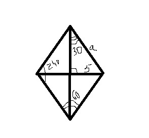 3) Сделаем рисунок. Отметим d=10, проведем вторую диагональ, вторая диагональ разделит первую на 2 равных части = 5, нам известен угол = 120, получается 120+120=240, значит на другие два угла приходится 360-240=120, угол меньший будет = 60, рассмотрим треугольник между диагоналями и с углом 30 (так как 60:2=30) в этом треугольнике угол = 90, другой 30, катет = 5, найти гипотенузу(т.е. сторону ромба) в прямоугольном треугольнике против угла 30 градусов лежит катет равный половине гипотенузы, а значит гипотенуза = 10