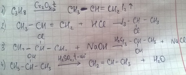 Пропан ( над стрелочкой (CrO3)->x1(Hcl)-->x2(NaOh, H2O)-->x3(H2So4,3>160°)-->x4(+h2o)-->x5(CuO)-->x6