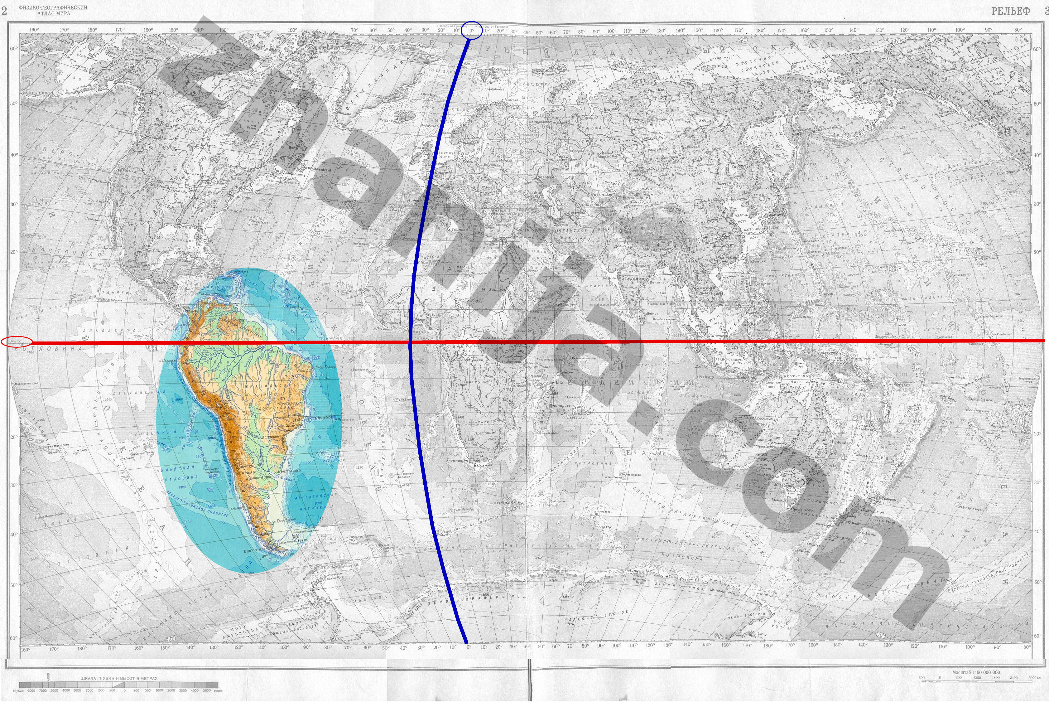 Экватор пересекает Южную Америку в СЕВЕРНОЙ части. Большая часть материка относительно экватора расположена в ЮЖНОМ полушарии. Нулевой меридиан расположен к ВОСТОКУ от Южной Америки. Относительно Гринвичского меридиана территории материка расположена в ЗАПАДНОМ полушарии.
