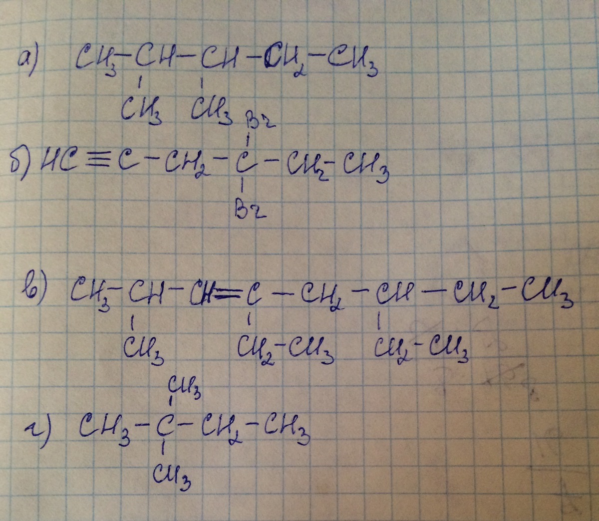 составьте структурные формулы следующих вещества а)2,3 диметилпентен б)4,4 дибромгексин-1 в)2-метил-4,6-диэтилоктен-3 г)2,2-диметилбутан