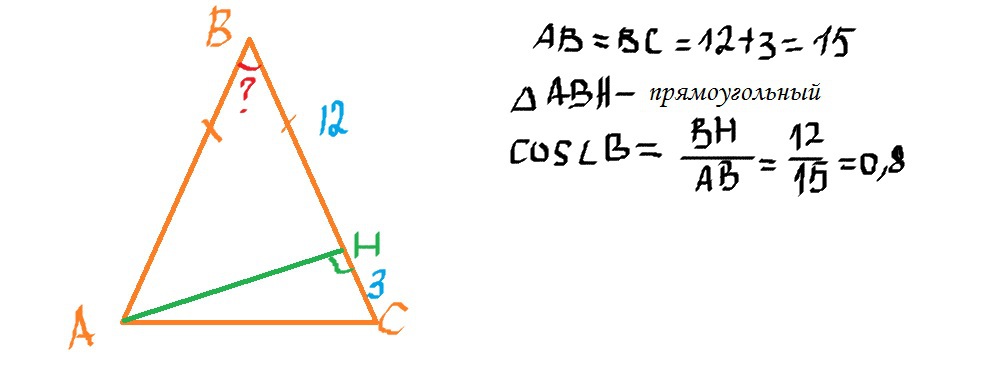 в треугольнике АВС угол АВ = ВС,а высота АН делит сторону ВС на отрезки ВН = 12 и СН =3.Найдите косинус угла В.